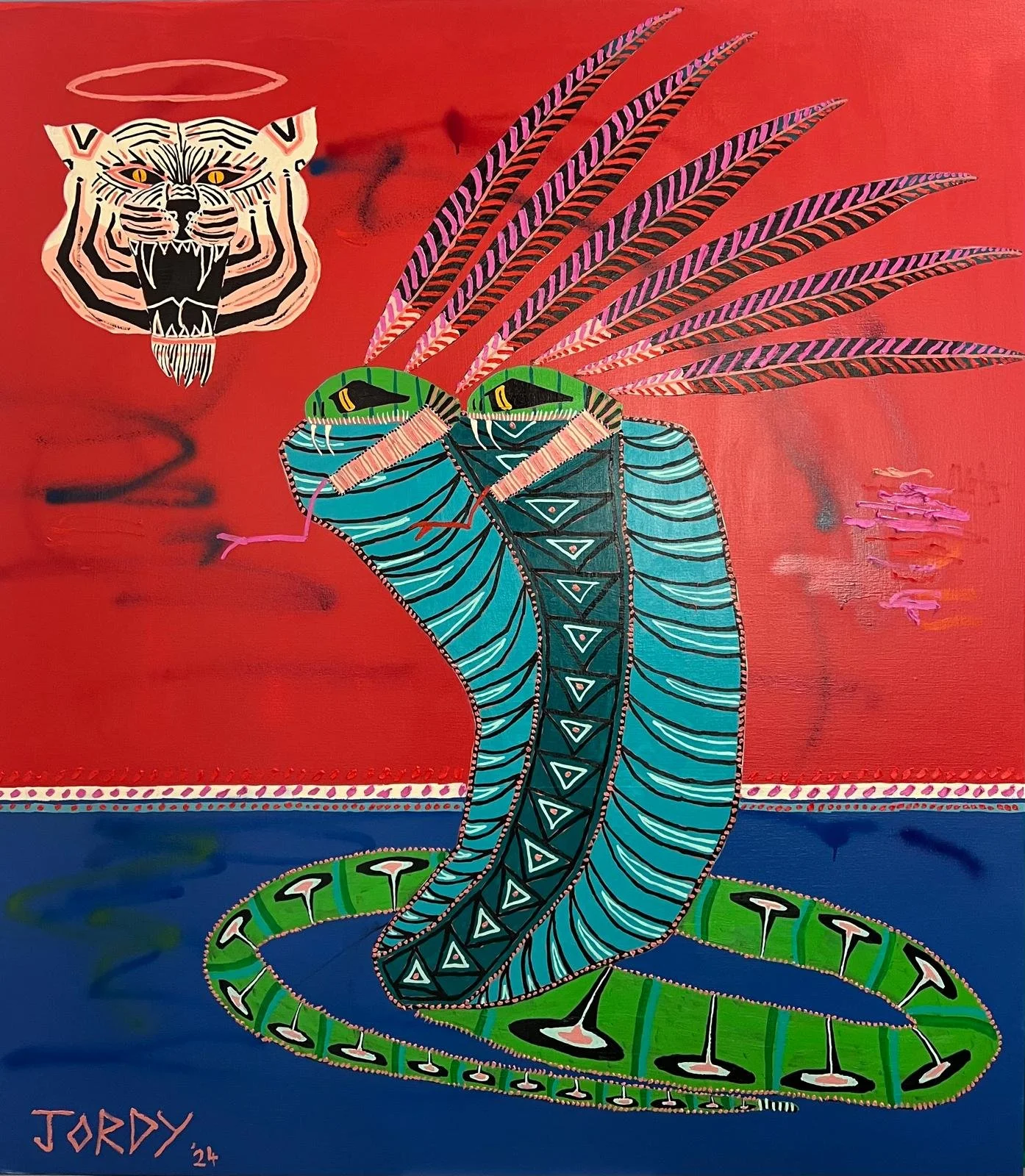 Jordy has rapidly gained global recognition with his distinctive style which is characterised by textured compositions rich in pattern and color, achieved through the use of oil, acrylic, and spray paint on canvas.