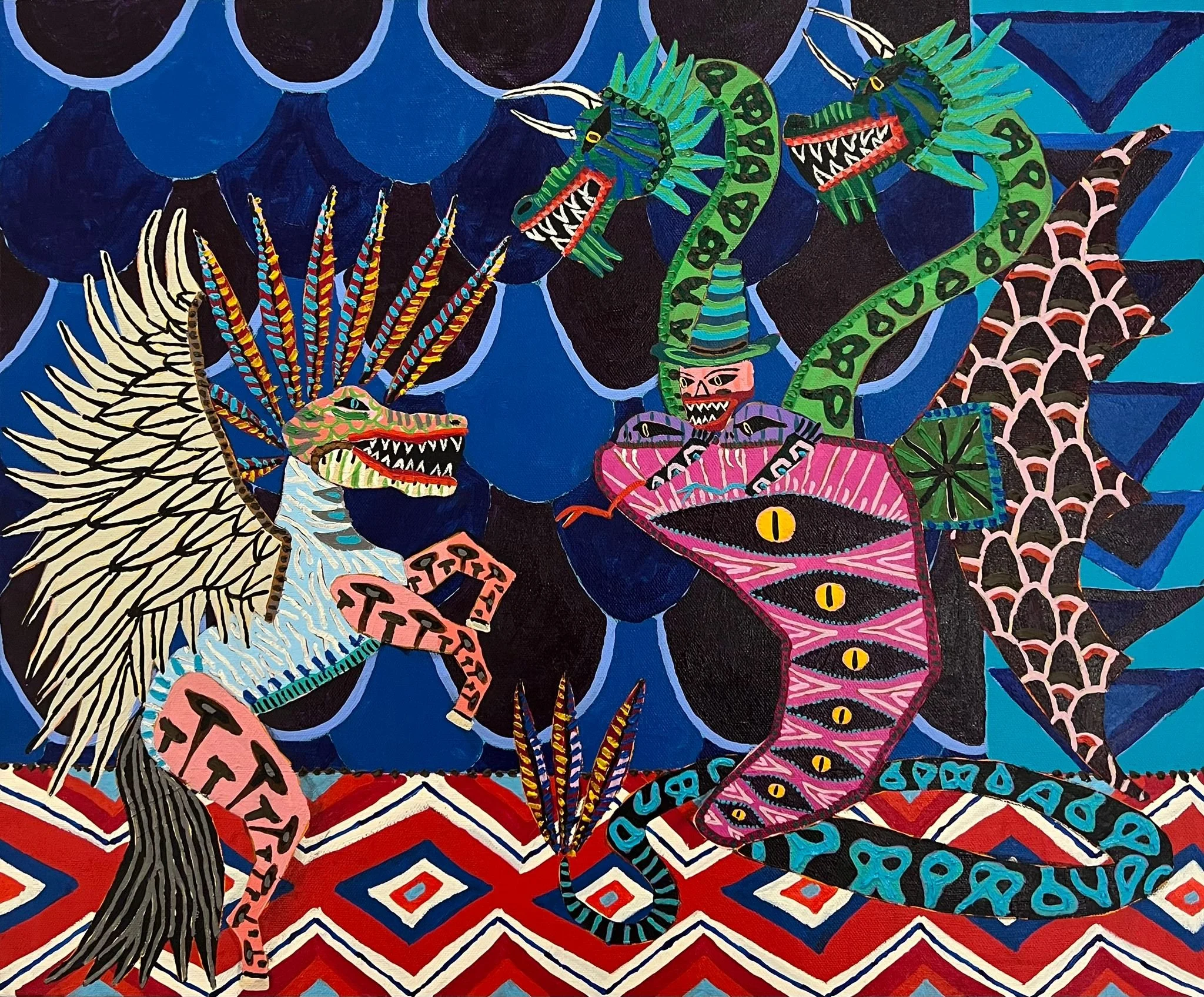 Jordy Kerwick’s paintings unravel like modern-day fables, where animals and landscapes exist in a dreamlike state—familiar yet untamed, primal yet poetic. His textured layers and distinctive use of color create a world where tigers, wolves, and serpents move freely between the real and the mythical. Rooted in his Australian identity, Kerwick channels the vastness of the wild landscape into his compositions, transforming nature into a theater of surreal storytelling.